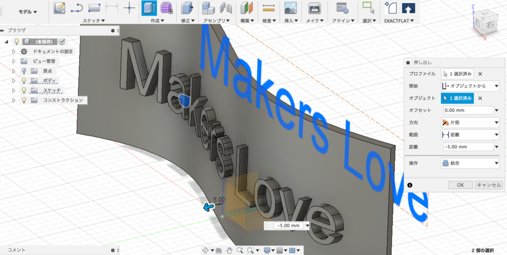 まず、押し出すためのプロファイルで文字を選択します。次に、位置のオプションで、曲面の選択し、距離に数値を入れます。